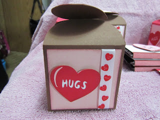 I filled each box with candy using both wrapped chocolate hearts and a bag of clear cello bag of either M&Ms (dark chocolate, my personal favorite!) or conversation hearts. I made six boxes in brown as shown and another six boxes in red which you can see if you look closely in the background. I used an assembly line process after designing my prototype. Thanks for looking, I hope you enjoy them.